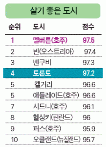 세계서 가장 살기 좋은 도시 멜버른 1위·밴쿠버 3위·토론토 4위