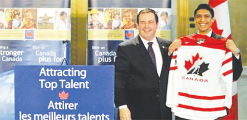 지난 9월 14일 성공적으로 자리잡은 경험 이민 프로그램을 자축하는 컨퍼런스에서 케니 장관이 2만번째 케이스인 고라브 가브와 포즈를 취하고 있다.