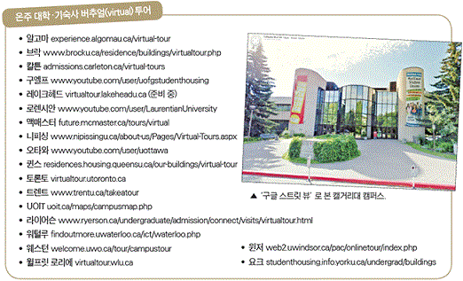이번에 추가된 것 외의 캐나다 4년제 대학 및 전문대들은 ‘캠퍼스투어(www.campustour.ca)’ 웹사이트를 통해 찾아볼 수 있다. 웹사이트는 구글 스트릿 뷰를 사용해 캠퍼스 내부를 비춰준다. 상세한 정도는 대학에 따라 다르다.