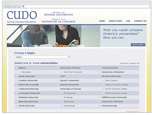 대학관련정보 수집기관인 CUDO(cudo.cou.on.ca)는 매년 온주 내 대학 학비, 평균성적, 신입생 수 등을 대학·년도·학과별로 정리해놓는다. 거리, 시간 등의 문제로 정보수집에 어려움을 겪는 학생 및 학부모들이 남에게 떠밀리지 않고 시간에 쫓기지 않는 상태에서 느긋이 원하는 정보를 얻을 수 있는 일종의 온라인 박람회인 셈이다.