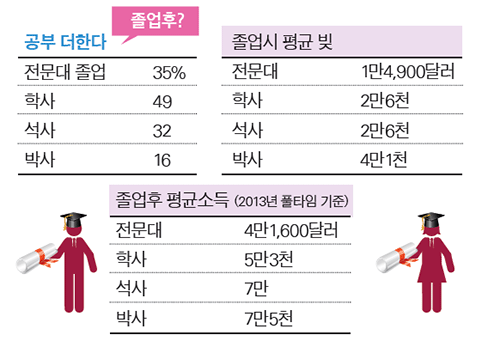물론, 교육기간이 늘어날수록 학생대출금 등으로 인한 빚도 늘어나는 게 보통이다. 그러나 관계자들은 석·박사 학위를 취득하면 소득수준이 더 높아지기 때문에 이런 부채를 더 빨리 갚아낼 능력도 확보할 수 있다고 지적했다.