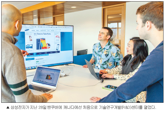삼성전자캐나다는 지난 28일 보도자료를 통해 “삼성이 캐나다에 처음으로 R&D센터를 열게 됐다. BC주 밴쿠버에 설립한 R&D센터에서 보안솔루션 등을 비롯해 각종 보안 소프트웨어에 대한 연구가 이뤄질 계획이며 기업 간 전자상거래(B2B)에 대한 기술지원도 제공할 예정”이라고 발표했다.