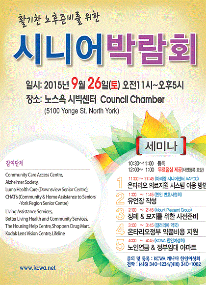 ‘시니어 박람회’는 9월26일(토) 오전 11시∼오후 5시 노스욕 시빅센터 내 ‘Council Chamber’에서 다섯 주제들의 세미나와 커미티룸 3호에서 의료, 보건, 재정, 하우징, 커뮤니티 헬스서비스, 시니어센터 관련 기관들의 부스를 통해서 다양한 정보와 개인상담을 제공합니다. 사전등록을 위하여 연락하시기 바랍니다. (416)340-1234/340-1082 www.kcwa.net