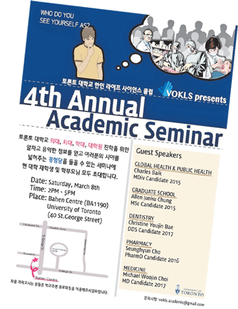 토론토대 한인생명과학클럽(Volunteer Organization of Korean Life-science Students)은 제4회 연례 아카데믹 세미나를 3월8일(토) 오후 2~5시 토론토대 세인트조지캠퍼스(40 St. George St.) 바헨(Bahen)센터에서 개최한다.