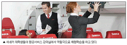 실제 항공기가 아닌 세네카(Seneca)칼리지의 항공서비스(Flight Services) 강의실의 풍경이다. 일반석, 비즈니스 클래스는 물론, 갤리, 오버윙, 비상구 등으로 구성된 교실이 마치 항공기 내부처럼 꾸며져 있어 학생들이 실제 공간에서 승무원의 업무를 체험해볼 수 있도록 한다.