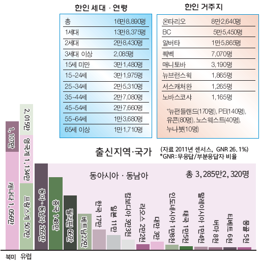 한인은 무려 81%가 온타리오와 BC주에 집중돼 있는 것으로 나타났다. 온주에 살고 있는 한인은 8만2,640명, BC주는 5만5,450명으로 집계됐다. 기타 주의 한인인구는 알버타(1만5,865명), 퀘벡주(7,070명), 매니토바(3,190명), 뉴브런스윅(1,865명), 서스캐처완(1,265명), 노바스코샤(1,165명), 뉴펀들랜드(170명), PEI(140명), 유콘(80명), 노스웨스트(40명), 누나붓(10명) 순이었다.