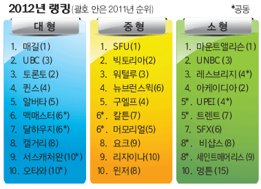 중형대학 부문에서는 SFU에 이어 BC주 빅토리아대가 올해도 2위를 유지했다. 또한 소형대학 부문에서는 불과 18년 전 BC주 프린스조지에 설립된 UNBC가 14년 전 9위에서 지난해 3위, 올해 2위로 급부상했다. 알버타의 레스브리지대도 지난해 공동 4위에서 3위로 상승했다.
