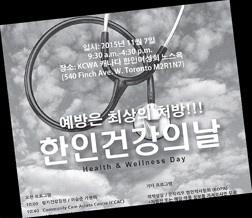 2015년, 11월 7일(토), 한인 여성회 노스욕 캐나다한인여성회(KCWA)에서는 캐나다에 거주하는 한인 이민자들의 건강에 대한 인식을 높이고 보다 정확한 정보에 대한 접근으로 건강한 라이프스타일을 추구할 수 있도록 ‘한인 건강의 날’ 행사를 기획하여 운영하고 있습니다. 2014년을 첫 시작으로, 올해 두 번째를 맞는 한인 건강의 날 행사는 여성회와 한인의사협회, 온주한인약사협회, 온주한인간호사협회가 공동 주관하는 행사입니다. 특별히 올해에는 ‘예방은 최선의 처방’이라는 주제를 가지고 예방의 중요성에 주안점을 두고 프로그램을 준비하였습니다. 정기건강검진, 커뮤니티 케어센터 이용안내, 노인건강관리, 노인정신건강관리를 주제로 오전에 4개의 세미나가 진행될 예정이며, 독감, 치아 웰빙, 아동 정기건강검진, 청소년 정신건강을 주제로 오후 세미나가 예정되어 있습니다. 각 분야의 전문의들을 모시고 각종 질병을 사전에 예방할 수 있는 연령·대상별 건강관리 방법에 대해 정보를 얻을 수 있는 귀중한 시간이 될 것입니다. 또한 8개의 세미나와 더불어 직접 체험하고 이용할 수 있는 프로그램들도 준비되어 있습니다. 유니슨(UNISON)의 협조로 독감예방 접종을 무료로 실시할 예정인데 이는 온주 의료보험카드를 가지지 않은 임시 워크퍼밋 소유자나 방문자들 또한 접종이 가능하며 선착순으로 서비스를 제공할 예정입니다. 여성을 위한 자궁경부암검사, 질염검사, 임신반응검사는 여성이민자 헬스센터와의 협업으로 이루어지며 산부인과 전문의와 직접 상담하실 수 있습니다. 이 또한 온타리오 의료보험 혜택에서 제외되는 분들도 서비스를 받으실 수가 있으며, 인원 제한 상 반드시 사전예약이 필요합니다. 온주약사협회에서 약사들이 행사 당일 상주하며 의약상담도 제공할 예정입니다. 가정에서 복용하는 약에 대한 궁금증이 있다면, 개인의 처방전이나 약품을 직접 가져오셔서 약사들과 만나 의문점을 해소하고 의약품 정보를 얻을 수 있는 시간을 가질 수 있습니다. 또한 온주간호사협회에서는 커뮤니티케어센터와 함께 당뇨교육을 실시합니다. 당뇨가 있으신 분들은 사용 중인 혈당계를 가져오셔도 좋으며, 당뇨의 종류와 그에 따른 건강관리법에 대해 일대일로 상세하게 상담 받으실 수 있는 시간이 될 것입니다. 아래 프로그램 시간표를 참고하시어, 건강의 중요성에 대해 다시 한 번 생각하고 많은 정보를 얻어갈 수 있기를 바랍니다. 오전 10시: 정기건강검진(이승준 가정의) 오전 10시40분: 커뮤니티케어센터 이용안내(박해미 간호사) 오전 11시20분: 노인건강관리(김진영 가정의) 낮 12시: 노인정신건강(김헌태 정신의학과 레지던트) 낮 12시30분: 질의응답 오후 1시30분: 독감과 감기, 독감예방주사(이상오 가정의) 오후 2시10분: 치아 웰빙(이자넷 치과전문의) 오후 2시50분: 아동정기건강검진(배헬렌 소아과전문의) 오후 3시30분: 청소년정신건강(민소윤 정신의학과 전문의) 오후 4시: 질의응답 기타 프로그램 오전 10시∼오후 1시: 독감예방접종(유니슨) 오전 10시∼오후 3시: 자궁경부암 & 질염검사(여성이민자 건강센터) 오전 10시∼오후 4시: 의약상담(온주한인약사협회) 오전 10시∼오후 4시: 당뇨교육(온주한인간호사협회) 사전등록·문의: (416)340-1234 또는 hyowon.kim@kcwa.net 캐나다 한국일보